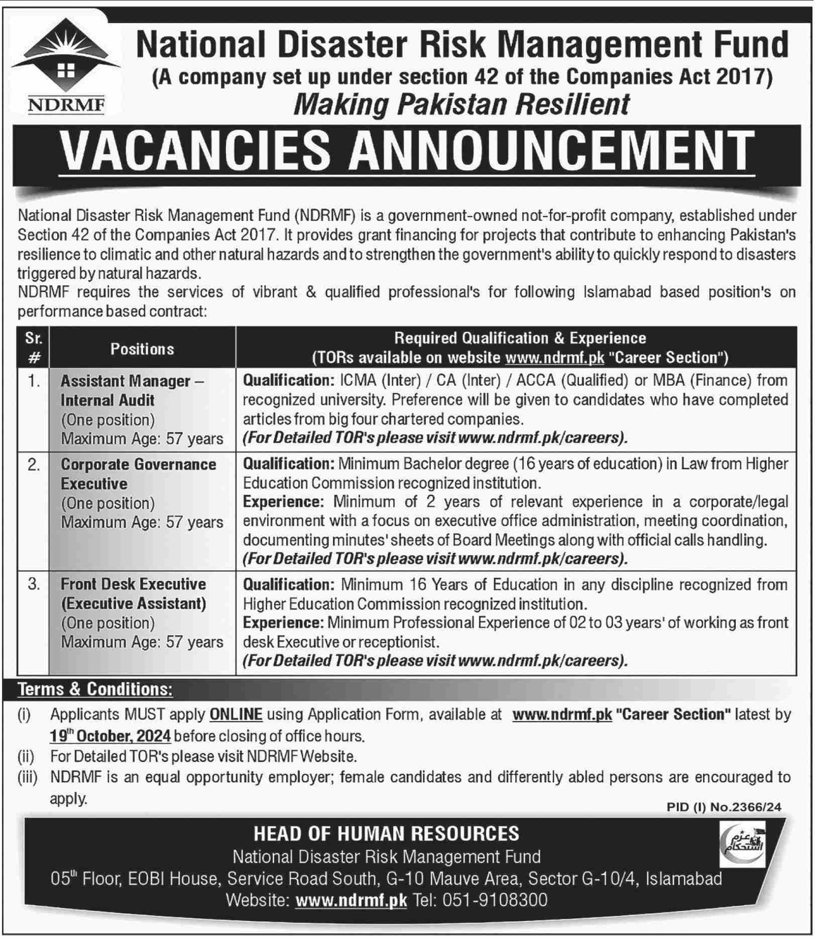 (i) Applicants MUST apply ONLINE using Application Form, available at www.ndrmf.pk “Career Section” latest by 19th October, 2024 before closing of office hours.